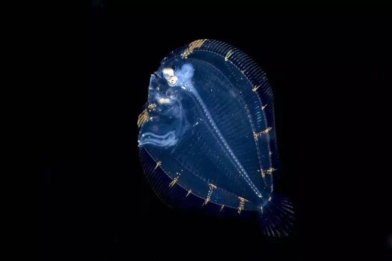 比目魚本身是一種隨處可見的普通魚類,不過像這樣散發(fā)熒光、通體透明的小家伙卻十分罕見。它們與箱鲀一樣大多都是成年比目魚剛誕下不久的幼兒,之所以將自己的身體打造得如此通透,多半是為了使自己過于醒目的“大餅”身材遠(yuǎn)離獵食者貪婪的視線。長到了一定的年歲,比目魚的周身就會(huì)逐漸出現(xiàn)飽滿的深色,這層具備偽裝性的體色能助它順利混跡在海底沙礫中,轉(zhuǎn)用另一種方式騙過獵食者的眼睛。