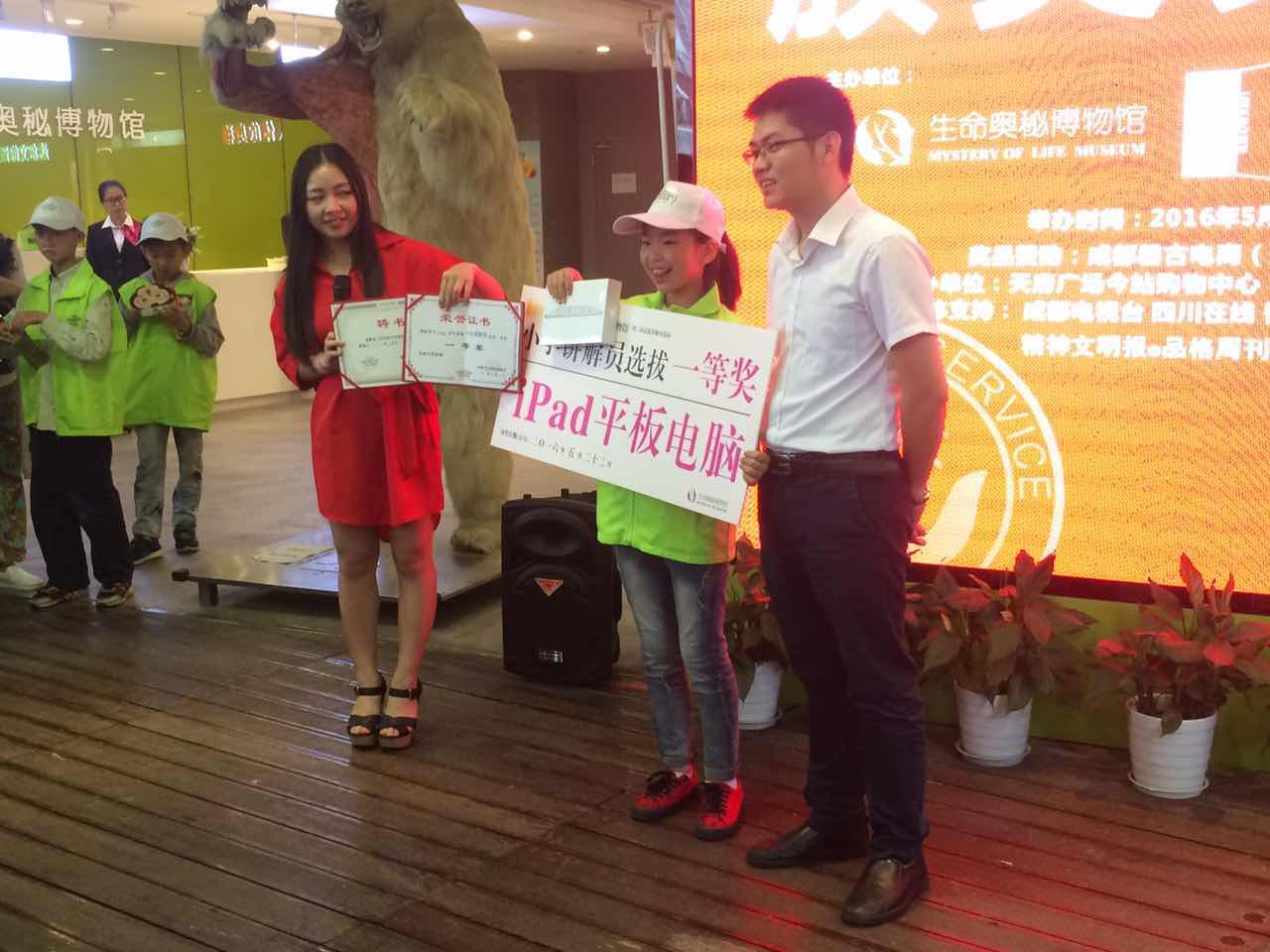 選拔于2016年5月22日下午成都生命奧秘博物館舉辦了盛大的小小講解員頒獎典禮。博物館館長吳軍、副館長文勇及頒獎嘉賓鄭德賢等見證者分別為:一等獎得主王舒雅,二等獎得主陳晗、韓家池,三等獎得主吳雨菲、廖家民、楊梓瀟,及多位優(yōu)秀獎得主,共計(jì)30人次頒發(fā)了獎項(xiàng)。